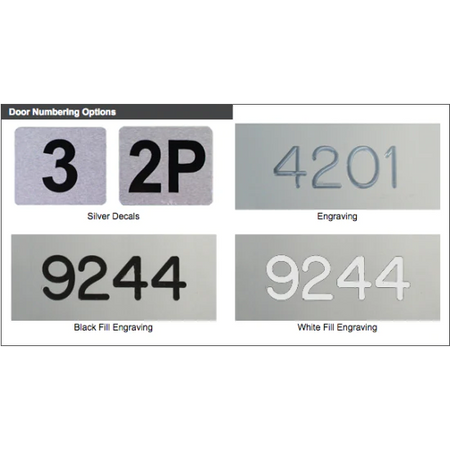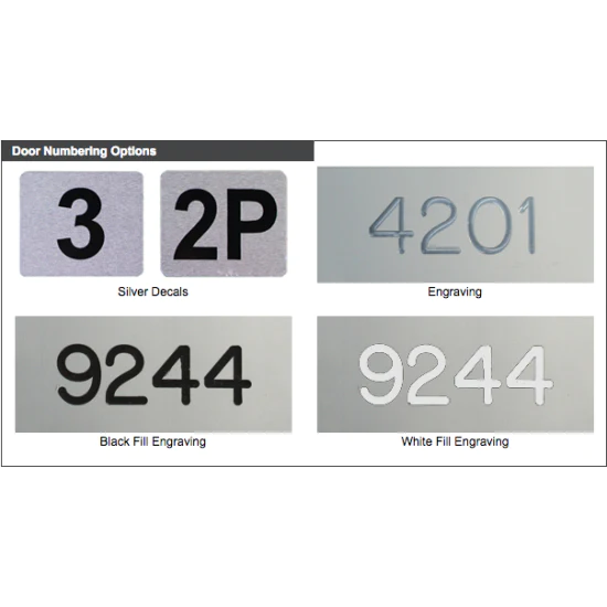 - Silver adhesive decals with black numbers 1 thru 13, 1P are included for door identification